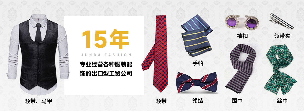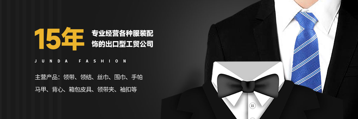 上饒市駿達服飾有限公司是一家專業經營各種服裝配飾的出口型工貿公司,公司多年來致力各種男女服裝國際流行配飾的開發(fā)和生產,主要產品為領帶、領結、絲巾、圍巾、手帕、馬甲、背心、箱包皮具、領帶夾、袖扣等,有豐富的內外銷經驗及廣泛的國內外銷售渠道,生產基地管理嚴格,質量過硬,并有一批生產加工企業長期合作